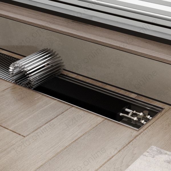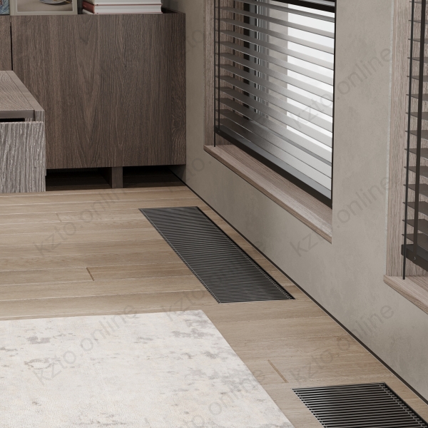 Такие устройства формируют тепловую завесу, которая препятствует проникновению холодного воздуха от окон и снижает вероятность образования конденсата на стекле. Конвекторы устанавливаются в конструкцию пола, при этом снаружи остается видимой только декоративная решетка. Она может быть выполнена из анодированного алюминия, полированной нержавеющей стали или ценных пород древесины и гармонично вписывается в напольное покрытие.
