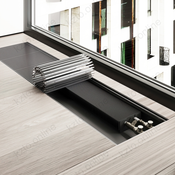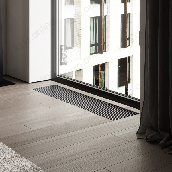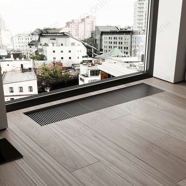Такие устройства формируют тепловую завесу, которая препятствует проникновению холодного воздуха от окон и снижает вероятность образования конденсата на стекле. Конвекторы устанавливаются в конструкцию пола, при этом снаружи остается видимой только декоративная решетка. Она может быть выполнена из анодированного алюминия, полированной нержавеющей стали или ценных пород древесины и гармонично вписывается в напольное покрытие.
